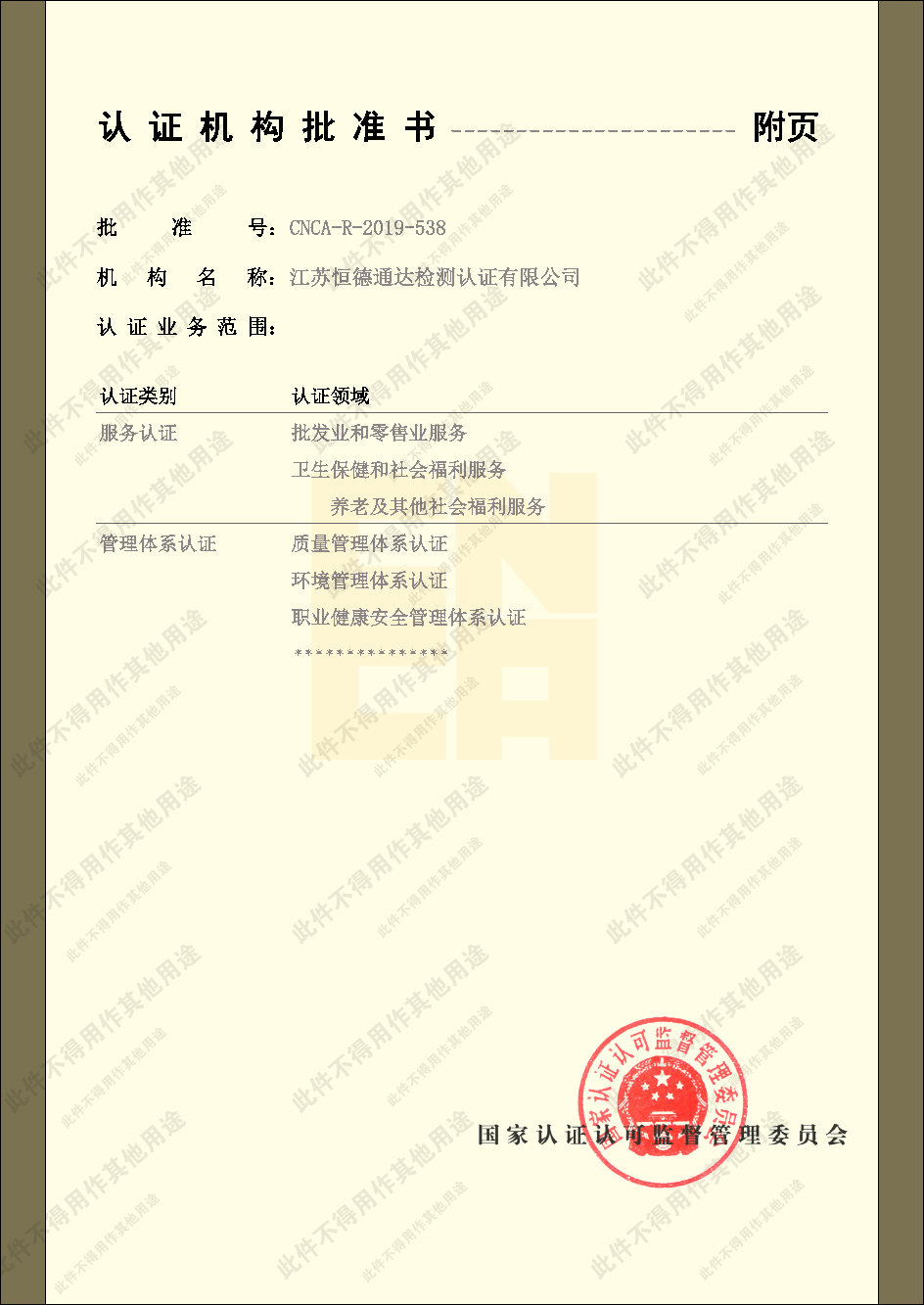 江苏恒德通达检测认证有限公司管理体系认证领域为:质量管理体系、环境管理体系、职业健康安全管理体系服务认证认证领域为:批发业和零售业服务、卫生保健和社会福利服务、养老及其他社会福利服务